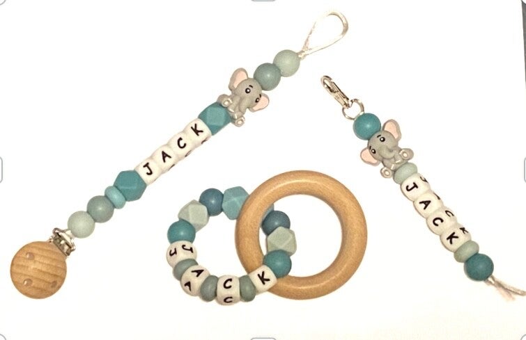 Het pakket bestaat uit een speenkoord, een bijtring en een sleutelhanger, allemaal afgewerkt met zachte kleuren en een lief olifantje. De accessoires worden gepersonaliseerd met de naam van de baby, wat het cadeau extra uniek en persoonlijk maakt.